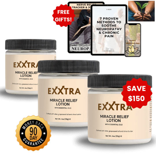 Exxtra Miracle Relief Lotion is a doctor-backed nerve relief formula that soothes burning, tingling, and numbness by delivering powerful natural ingredients directly through the skin. It restores circulation, reduces inflammation, and repairs nerve damage using ingredients like Vitamin E, Menthol (TRPM8 activation), Shark Cartilage, Rosehip Oil, Collagen, and Vitamin K2.