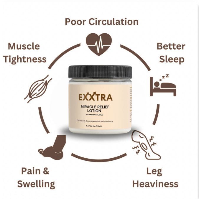 Exxtra Miracle Lotion works quickly to address swelling and fluid retention, offering the relief you need to feel lighter, move freely, and live pain-free.